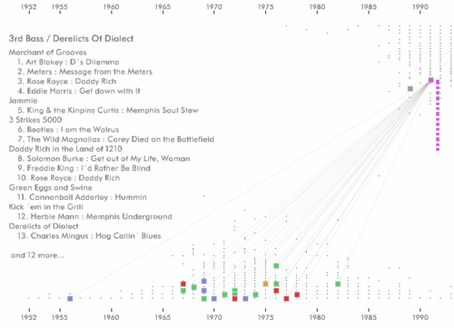 (via ni9e blog) The history of sampling. A Java applet that shows songs that were sampled, and who sampled them. You can click on an album to see which songs it samples, or on the "samplee" to see who sampled it.